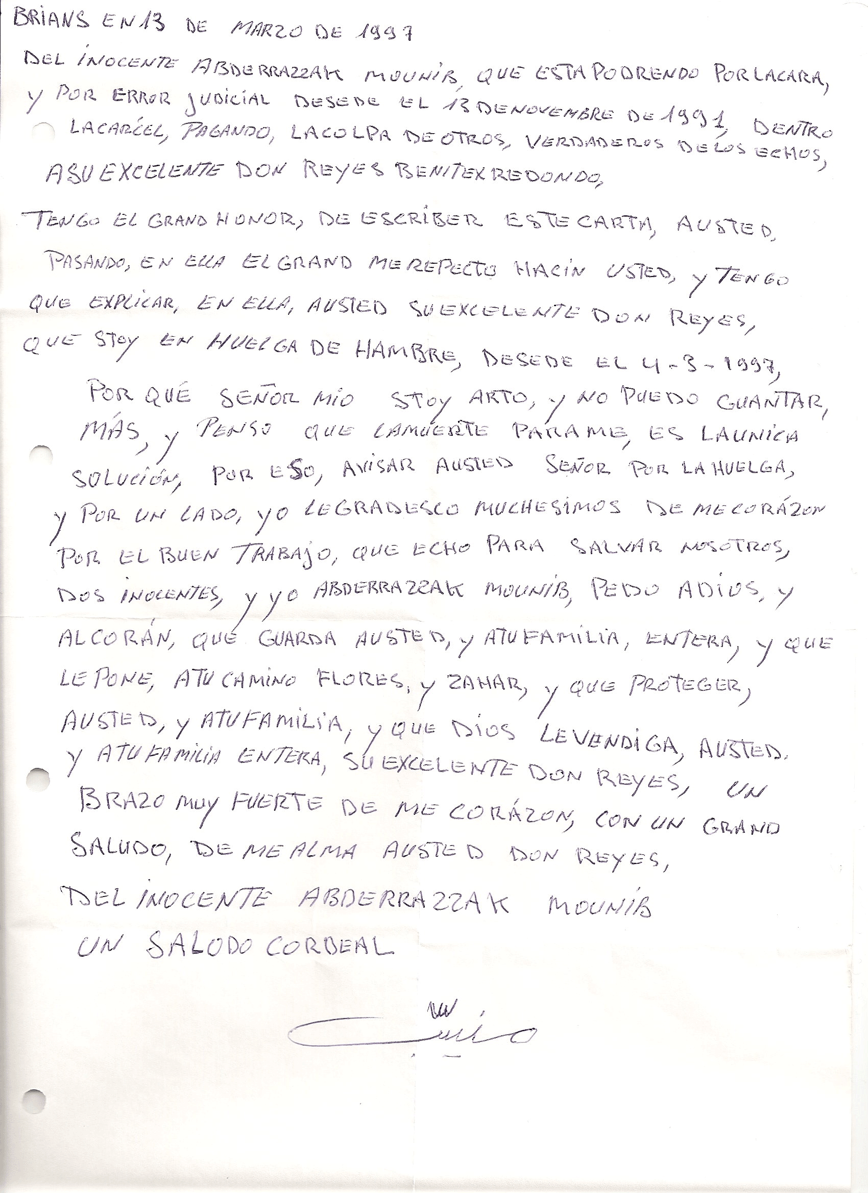 No. No puede durar tanto. De hecho, esa duración es la prueba de que no es un error. La teoría del error sirve, ante todo, para emborronar la posibilidad de que haya habido seis errores (fueron condenados en dos causas conjuntamente, y luego en dos más cada uno por su lado), que es una de las hipótesis que quiero demostrar en el libro. Pero más allá de eso. Creo que esta historia tiene dos partes: en la primera (hasta que se demuestra el error en una de las condenas, en la que se logró perfilar genéticamente unas muestras de semen), los marroquíes habrían sido condenados siendo inocentes. En la segunda, de ahí en adelante: su condena actual está resumida en una frase del anterior Ministro de Justicia, Juan Fernando L. A., cuando le preguntaron por el caso hace ahora un año: «El Gobierno ha decidido que no es un mensaje asumible indultar a una persona condenada por violación». Esa frase dice muchas cosas, casi todas involuntariamente. Dice, por ejemplo, que, a pesar de que el indulto como tal sigue sin resolverse (esto es, que ni se ha concecido ni denegado), ya se ha tomado la decisión y que se ha tomado fuera del Consejo de Ministros, que es donde está democráticamente previsto que se haga. Dice, además, y literalmente: «mensaje asumible»: esto es, que el hecho de indultar a Ahmed y Abderrazak, no constituye, por ejemplo, una posible salida legal, más o menos digna, a dos vidas arruinadas, con sus consecuencias prácticas: que fuera una forma de reconocer el error, por ejemplo, pues hace tiempo que se les habría denegado el indulto si no supieran que son inocentes. No: ya se trata sobre todo de un «mensaje». Y dice, por último, aunque sin decirlo, que no se atreve a decir «violador», sino «persona condenada por violación». La diferencia es brutal. Como se ve, las tres ideas afirmaciones, sin ser dicho, están diciendo que importa una higa si estos señores violaron o no violaron a las chicas. A Ahmed y a la familia de Mounib, sin embargo, sólo les importa eso: que se sepa que no violaron a las chicas.